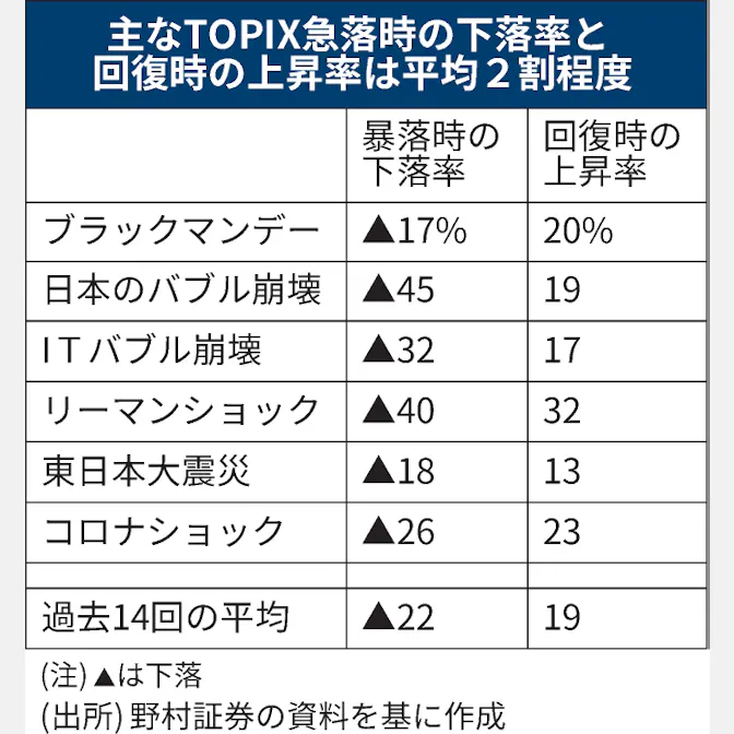 野村証券が1987年のブラックマンデーから今回の急落まで過去14回のTOPIXの急落局面について、第1波の底入れまでの下落率を調べたところ、平均は22%であり、底入れから次の高値を付けるまでの戻り局面での平均上昇率は19%になるようです。