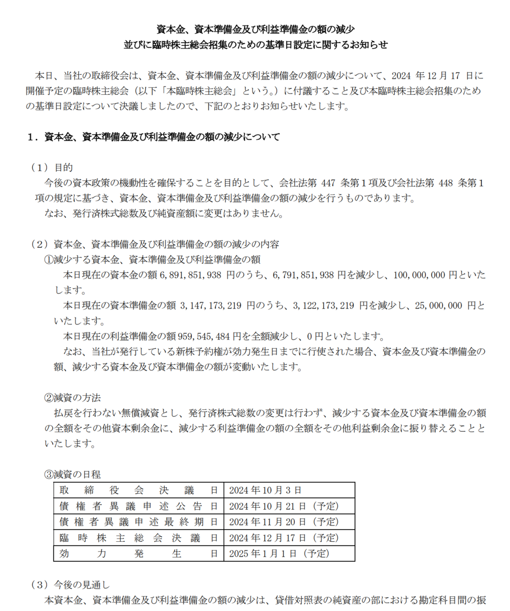 同社は、3日の取引終了後、12月17日開催予定の臨時株主総会において、資本金と資本準備金、利益準備金の減額について付議することを決めたと発表しました。