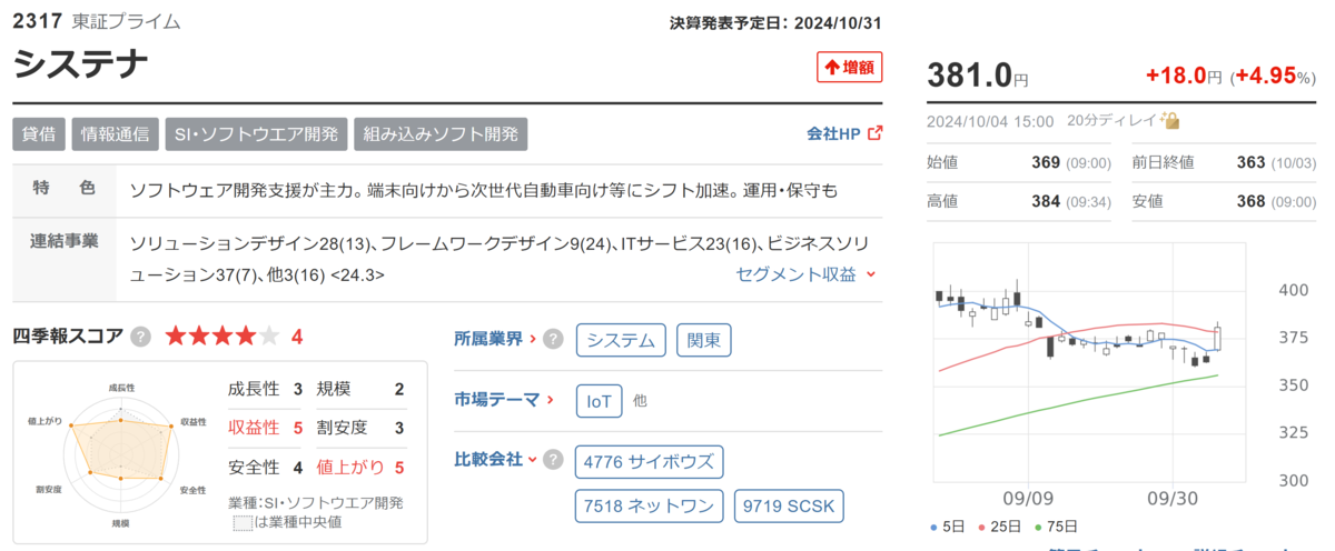 システナ(2317)が大幅連騰になっています。